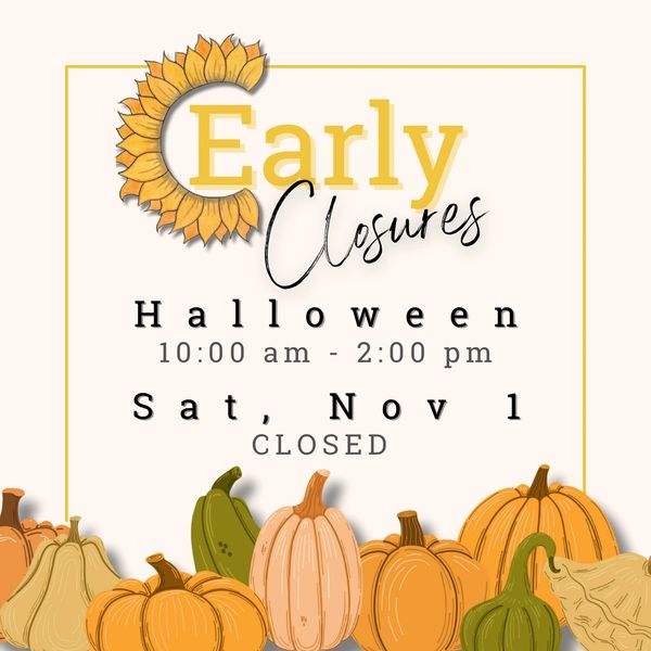 We will be open on Oct. 31st from 10:00 am and closing early at 2:00 pm.